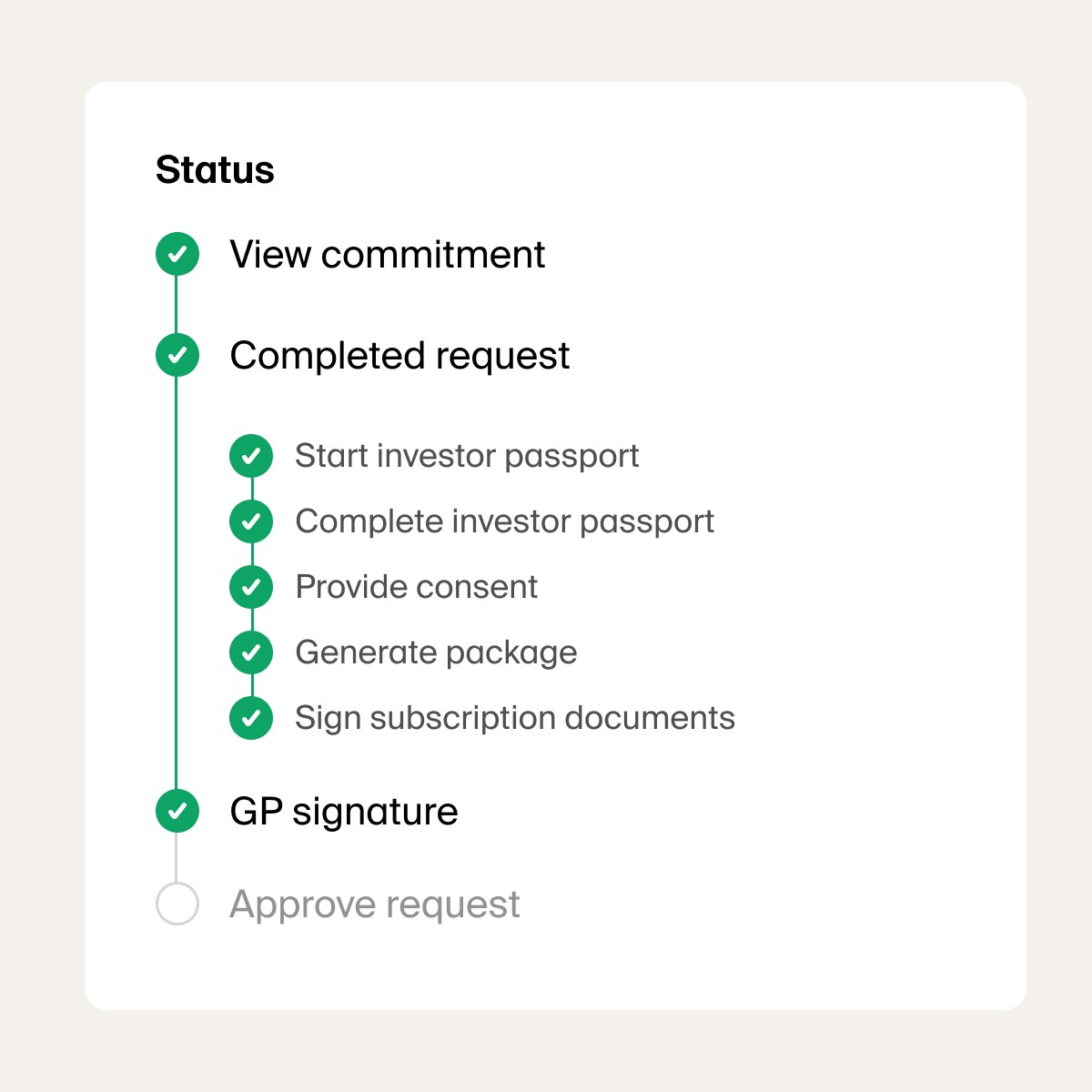 Your LPs receive a clean, branded email invitation and log in instantly using passwordless SSO with Google or Microsoft. Once inside, they’re guided through a simple, adaptive flow that captures their identity details, accreditation and suitability information, any entity-specific requirements based on their investor type, and, if they choose, their banking details for future distributions. All documents populate automatically in the background, and LPs finalize the process with just a few clicks.