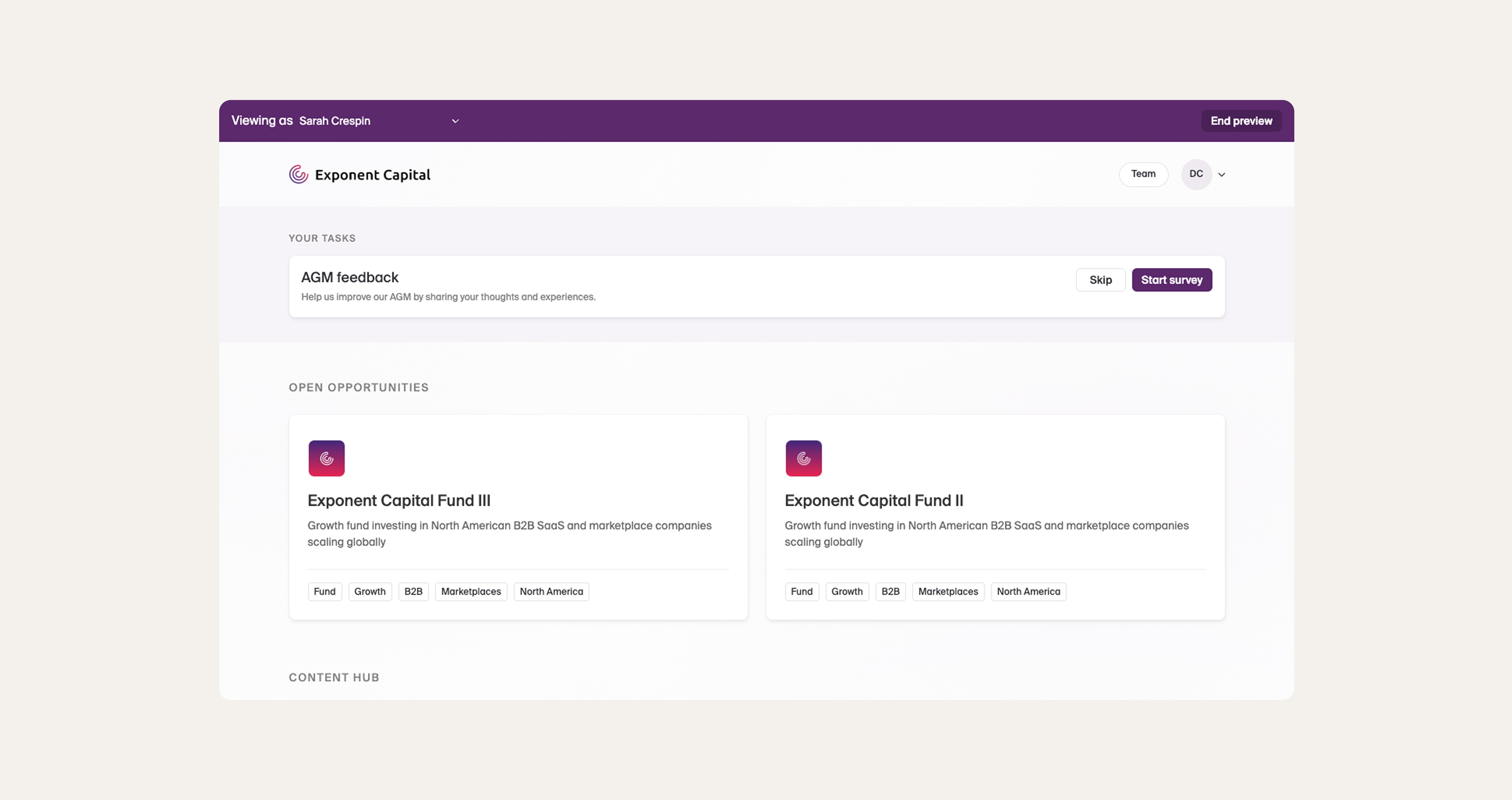 GPs can now "view as" an LP across the full investor portal, not just individual reporting pages. This includes the aggregate reporting dashboard, documents, tasks, and surveys, giving you a complete, end-to-end preview of the LP experience.